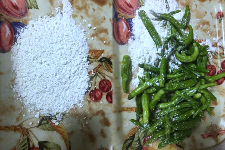 꽈리고추찜 만들기 2. 쟁반에 부침가루를 붓고 준비된 꽈리고추에 부침가루가 골고루 묻도록 잘 버무려줍니다.